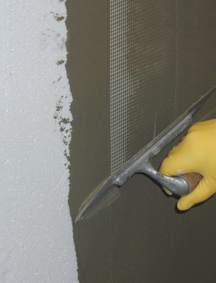 Армирование поверхности. Клеящий состав следует нанести зубчатым шпателем на утеплитель и утопить в нем армирующую стеклосетку. После этого на поверхность приклеенной сетки, необходимо нанести слой клея, толщиной мин 1мм (до полного покрытия сетки). Перед нанесением декоративного покрытия армирующий слой должен твердеть не менее 3 дней.